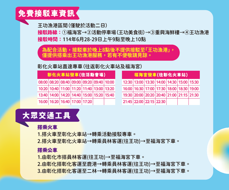 為配合活動,晚上8點後不提供前往「王功漁港」的接駁服務,僅提供從王功漁港離開的接駁服務,造成不便,敬請見諒。