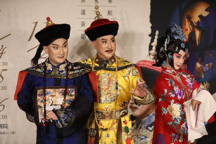 圖說:9月22日,臺灣國光劇團舉行戲劇《夢紅樓·乾隆與和珅》記者會,“乾隆”扮演者唐文華(中)、“和珅”扮演者溫宇航(左)、“王熙鳳”扮演者黃宇琳(右)等京劇演員亮相,演繹經典片段。(供圖)