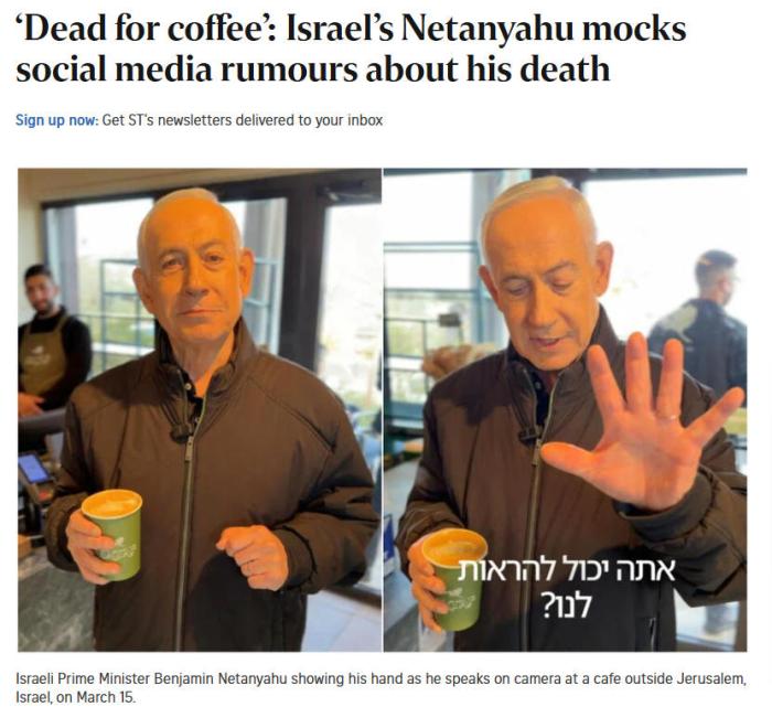 據路透社、《耶路撒冷郵報》等報導,視訊中,內塔尼亞胡身處一家咖啡店內。有人詢問了他有關傳聞的情況。內塔尼亞胡用雙關語回應說,“他們說我什麼來著?我超愛咖啡”(I’m dead for coffee)。