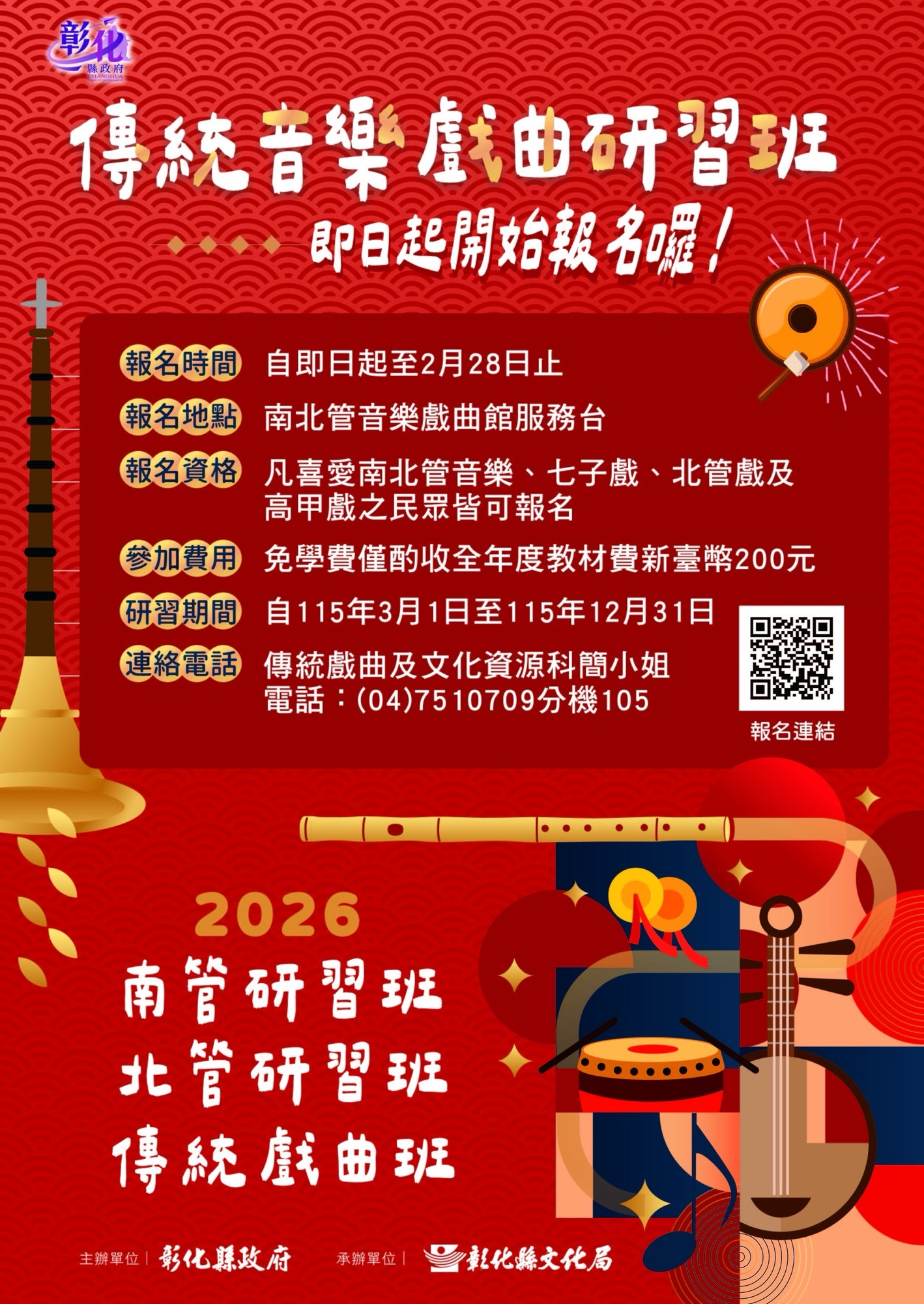 【記者林孟媛/彰化報導】彰化縣政府長期致力推動傳統音樂與戲曲藝術,今年持續辦理「115年度傳統音樂戲曲傳習計畫」研習班,即日起至2月28日開放報名。去年課程參與人數明顯成長、迴響熱烈,彰化縣文化局今年擴大開設13班研習課程,歡迎喜愛南北管及傳統戲曲的民眾踴躍參與。