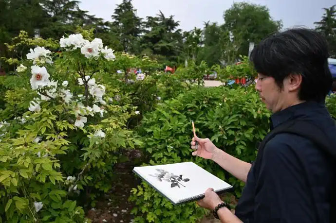 位於邙山腹地的國家牡丹園內花海如潮、花香四溢,花叢前,書畫家們拿出速寫本,以水墨、水彩、速寫等形式,在花香中開啟“沉浸式”創作,團內很多台灣成員,是第一次到洛陽采風寫生。