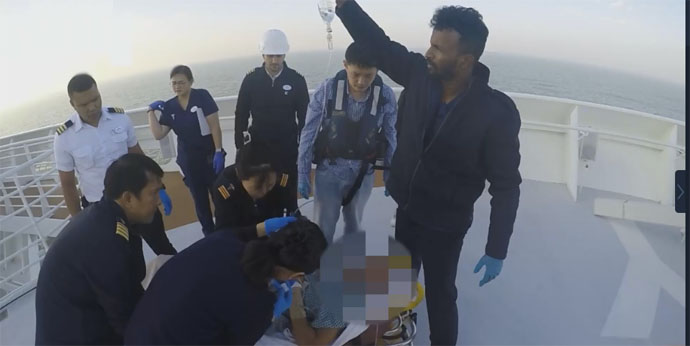 ↑圖說:醫生對台灣遊客先做急救措施(視頻截圖 來源:東海第二救助飛行隊)。
