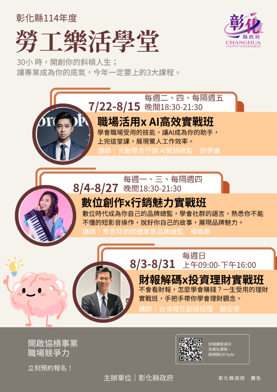 [記者 林孟媛報導]彰化縣政府為協助在職勞工強化職場技能,將於7月至8月開辦「勞工樂活學堂」系列課程,包含AI應用、數位行銷及投資理財三大熱門主題,每班限額30名,採免費報名方式,即日起開放至額滿為止。