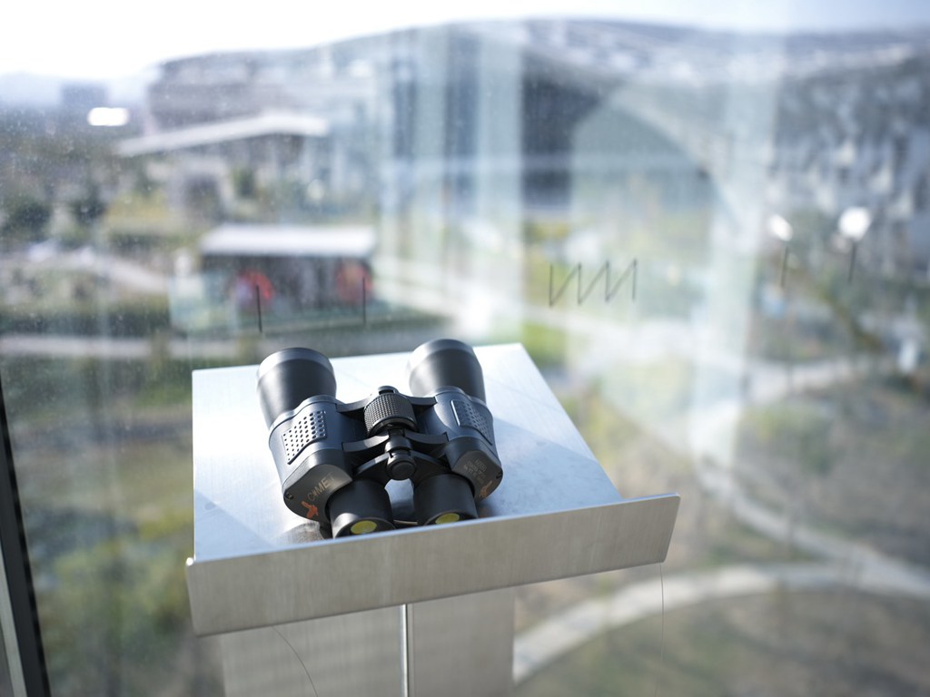 美術館六樓設有兩處不同觀看方向的望遠鏡,一處在五樓往六樓的外掛梯,視野遼闊,可盡覽中央公園熱門的野餐點、會展中心及周邊城市景觀,呈現最chill的視角;另一處則隱身展間後的公共空間中,透過望遠鏡向下觀看五樓展場,捕捉作品與觀眾互動的瞬間,為參觀體驗增添意外驚喜。