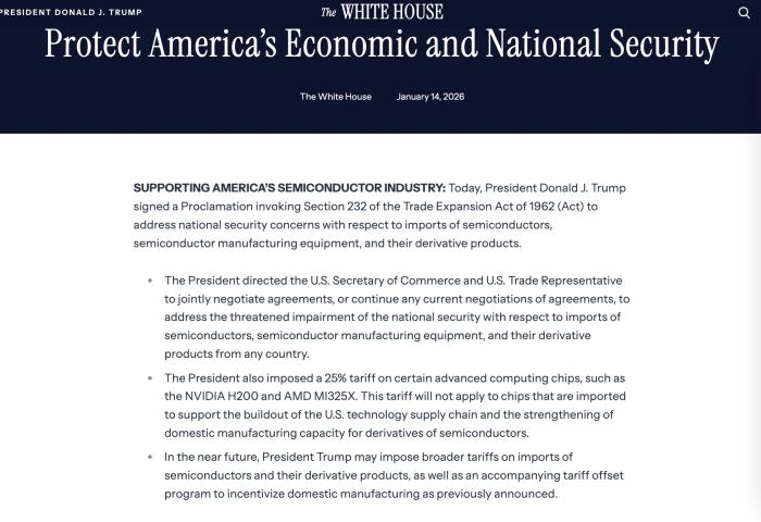[記者林璟坤/外電報導]根據美國白宮官網當地時間14日最新聲明,美國從15日起對部分進口半導體、半導體製造裝置和衍生品加徵25%的進口從價關稅。