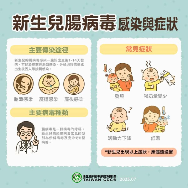 新生兒感染腸病毒可能出現發燒或低體溫、活力不佳、喝奶量變少等症狀,未及時治療可能發展為心肌炎、肝炎、腦炎等重症。家中嬰幼兒如經診斷感染腸病毒,請注意觀察是否出現嗜睡、意識不清、活力不佳、手腳無力、肌抽躍、持續嘔吐與呼吸急促或心跳加快等重症前兆病徵,務必立即轉送腸病毒重症責任醫院(彰化縣四家責任醫院:彰化基督教兒童醫院、秀傳紀念醫院、彰濱秀傳紀念醫院、衛生福利部彰化醫院)接受治療,以免錯過黃金治療時間。