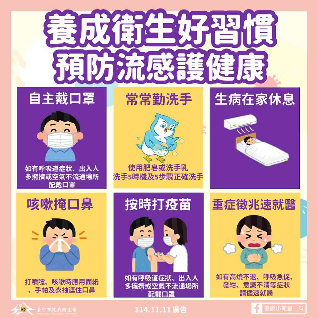 近期氣溫驟降、早晚溫差明顯,提醒市民朋友保持良好衛生習慣,包括正確洗手五步驟與五時機、打噴嚏時以面紙或衣袖遮口鼻等,並鼓勵符合公費疫苗接種資格的市民可運用台中市疫苗預約平台預約接種(https://gov.tw/hhv) 或查詢非平台預約方式洽合約院所預約( https://gov.tw/giV )儘速接種,以減少感染後重症或死亡風險,提升自身保護力,也保護家人。另疾管署自10月1日至11月15日擴大公費流感抗病毒藥劑使用,台中市共有644家合約院所,藥劑儲備量充足,民眾出現不適症狀應儘速戴口罩就醫並依醫囑治療。