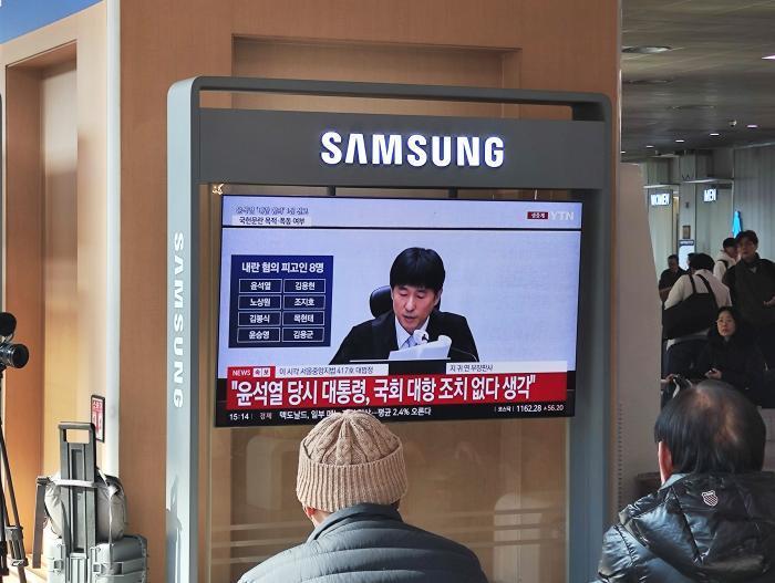 圖說:當地時間2月19日,在首爾站候車大廳,人們正在收看前總統尹錫悅涉嫌內亂頭目罪案一審宣判相關新聞。(供圖)